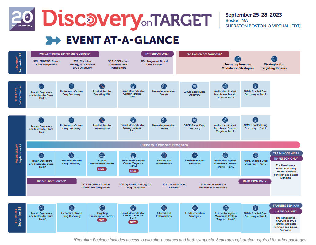 DOT20thAnniversaryeventbrings back popular topics like immunomodulation, protein degraders, and RNA, plus new, expanded, or returning programming on transcription factors, small molecules for cancer targets, and kinases.